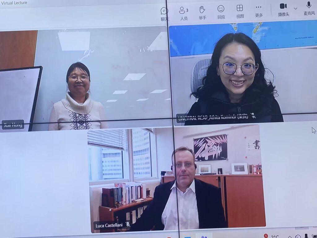 Professor Xue Hong, Director of Beijing Normal University Institute for Internet Policy & Law, talked at the beginning that BNU is one of the CLOUT Partner Organizations and has been working closely with UNCITRAL and RCAP. Prof. Xue then invited Ms. Athita Komindr, Head of UNCITRAL Regional Center for Asia and Pacific (RCAP), to give the keynote speech. Although joining the event virtually, Ms. Komindr gave an energetic presentation, introducing the wide range of works conducted by the RCAP and briefing for the BNU students the possibility to apply for the UN internship. Ms. Komindr’s rick experience in capacity building and international engagement impressed all the audience. Prof. Xue later invited Dr. Luca Castellani, Legal Officer in the Secretariat of UNCITRAL, gave the keynote speech on the UNCITRAL Newest Model Law on Automatic Contracting (MLAC). Dr. Castellani is a long-time friend of BNU and has been working for a decade as the secretary of UNCITRAL Working Group IV (E-Commerce). He went through the history of e-commerce lawmaking at UNCITRAL from 1990s to 21 century and elaborated the legal impacts of all the key provisions of MLAC.